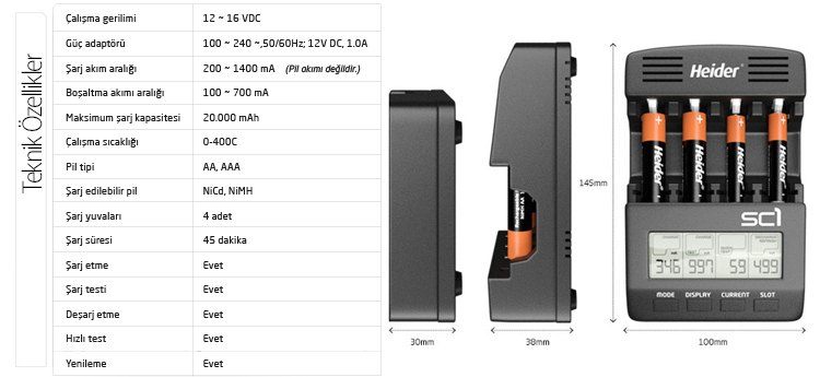 Öncelikle ürünümüze olan ilginizden dolayı teşekkür ederiz. Heider SC1; tüm şarj edilebilir Ni-Cd ve Ni-Mh AA, AAA tip piller (AAA ince kalem pil, AA kalem pil) üzerinde işlem yapabilme özelliğine sahiptir. Kısa sürede şarj edebilmesinin hiçbir dezavantajı olmadığı gibi mükemmel bir avantaj sağlar.